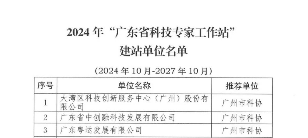日前,广东省科协公布了《2024年广东省科技专家工作站建站单位名单(2024年10月-2027年10月)》,大湾区科技创新服务中心(广州)股份有限公司,广东省中创融科技发展有限公司、广东粤运发展有限公司等3家广州公司榜上有名,获批建立“广东省科技专家工作站”。