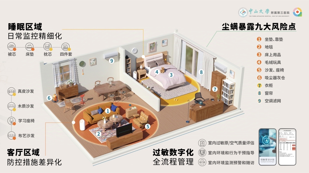 两年前,中山三院过敏科团队开启了“低敏家访”行动,走进天河区200多个家庭开展过敏原浓度检测,并根据数据标记出不同街区、不同家庭内,不同用品、角落的尘螨浓度等级,以揭示居家尘螨暴露风险。