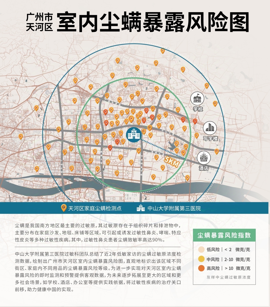 根据“低敏家访”成果绘制成的《室内尘螨暴露风险图》将进一步实现对天河区室内尘螨暴露风险的即时监测和预警提供客观数据。“我们无法将尘螨消除干净,但可以通过降低尘螨浓度,预防过敏性疾病。通过绘制并发布风险图,我们希望向过敏体质患者发出风险警示,注意重点场所卫生,以避免过敏症状发生。”中山三院过敏团队表示。