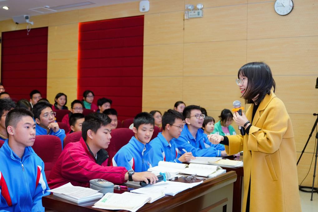 在高中课堂观摩环节,广州开发区外国语学校教师吴志波指导学生从《红楼梦》的文辞之美和旨趣之味出发,从书中诗词品读林黛玉和薛宝钗不同的性格和思想。