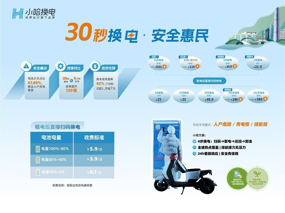 在电动自行车火灾事故中,47.89% 由充电环节引发,“入户充电”“飞线充电” 已成为城市安全治理痛点。小哈换电依托宁德时代顶尖电池技术与自研 8 重安全防护体系:包含消防模块、监控模块、独立灭火装置等,实现电池全生命周期实时监控。其智能换电柜不仅通过充换电设施认证,更搭载 GPS 防盗与极寒 、极热稳定运行技术,从根源上杜绝充电安全隐患。对比传统充电需 6-7 小时且无法监控电池状态的弊端,小哈换电以 “30 秒换电” 实现效率 120 倍提升,让市民彻底告别 “深夜充电焦虑”。
