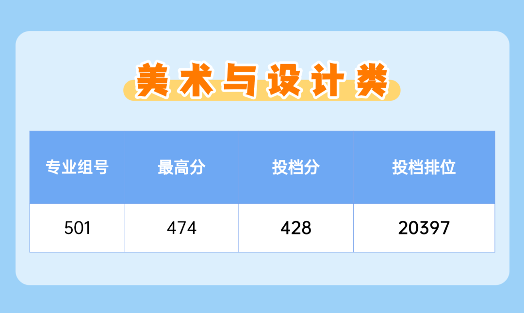 美术类专业组最高投档分为474分,最低投档分为428分。其中,数字媒体艺术设计专业为新增专业,今年首次招生就备受考生欢迎,最低投档分为441分。
