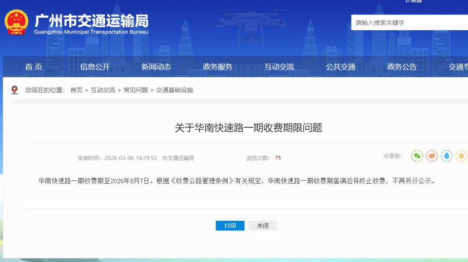 华南快速一期收费期至8月7日,届满后将终止收费