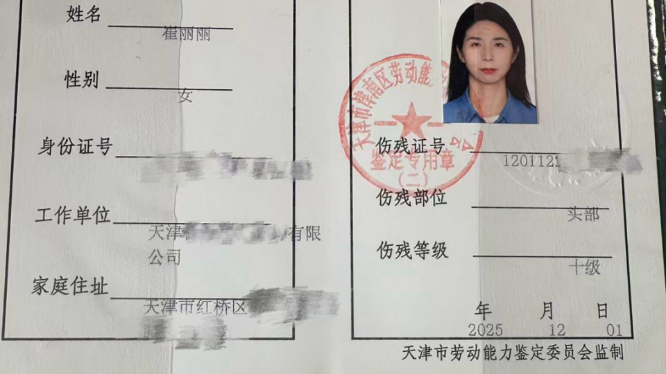 全国首例“职场性侵获工伤认定”案 当事人崔丽丽获工伤伤残证 评定为工伤十级伤残