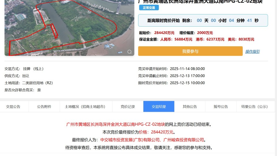 中交城投联合体28亿元底价拿下黄埔长洲岛低密临江地块
