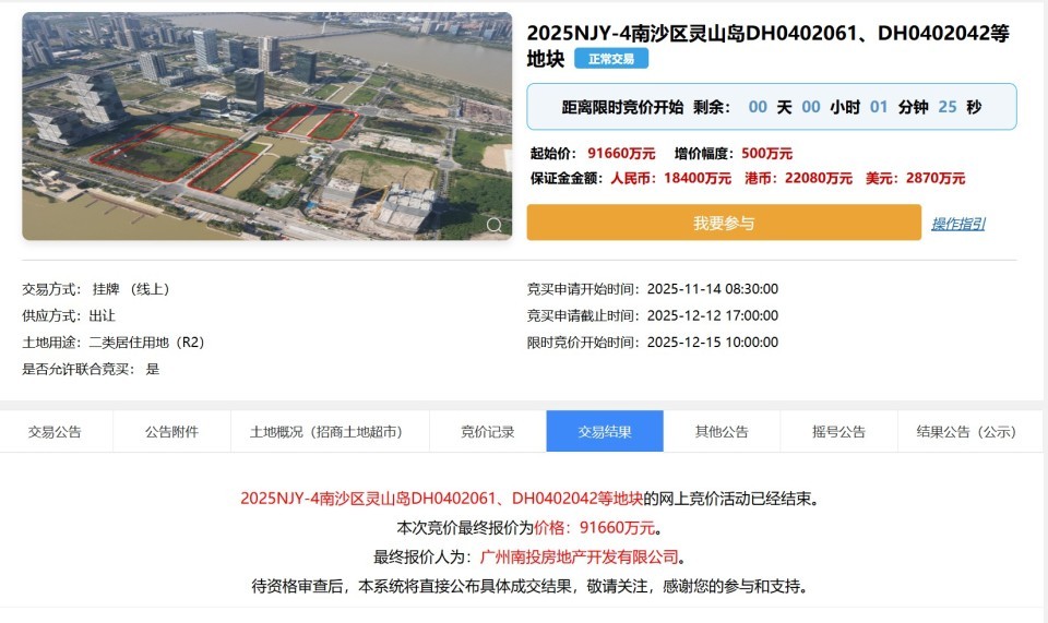 广州南投16.7亿元连拿南沙灵山岛两宗地块