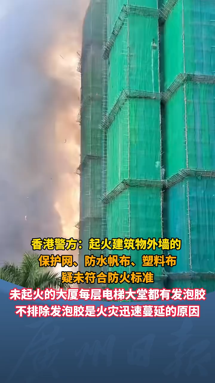 香港警方:起火建筑物外墙的 保护网、防水帆布、塑料布 疑未符合防火标准 未起火的大厦每层电梯大堂都有发泡胶 不排除发泡胶是火灾迅速蔓延的原因