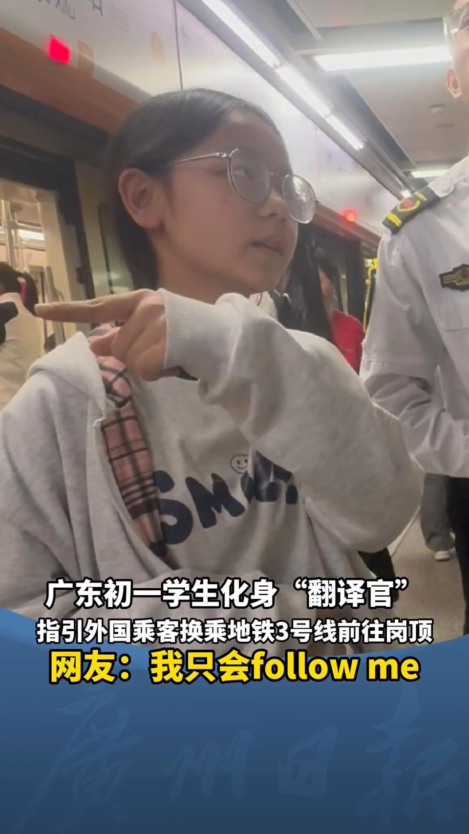 广东初一学生化身“翻译官”,指引外国乘客换乘地铁3号线前往岗顶,网友:是我的话只会follow me~