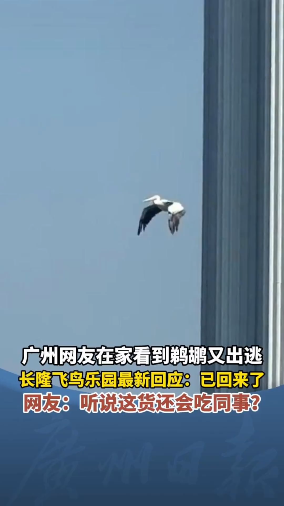 广州网友在家看到鹈鹕又出逃,长隆飞鸟乐园最新回应:已回来了!网友:听说这货还会吃同事?