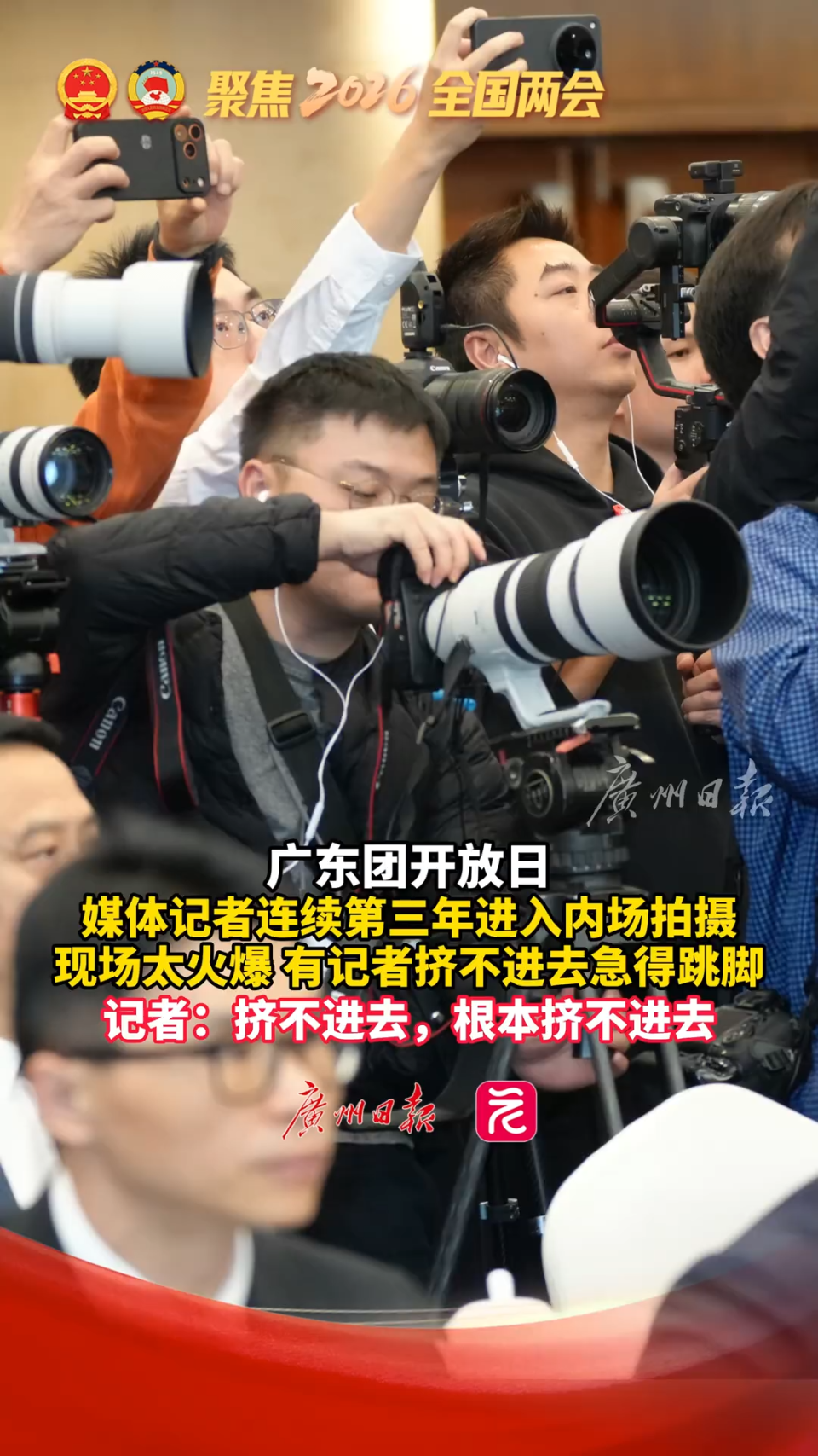 广东团开放日,媒体记者连续第三年进入内场拍摄,现场太火爆,有记者挤不进去急得跳脚,记者:挤不进去,根本挤不进去