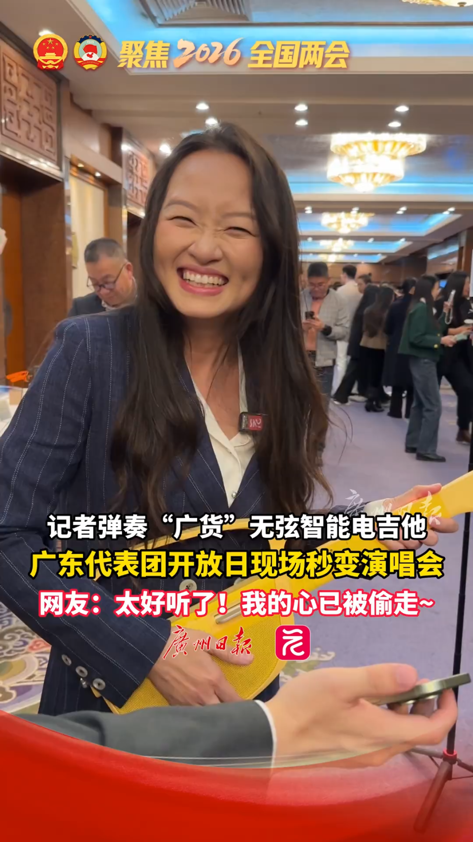 记者弹奏“广货”无弦智能电吉他,广东代表团开放日现场秒变演唱会,网友:太好听了!我的心已被偷走~