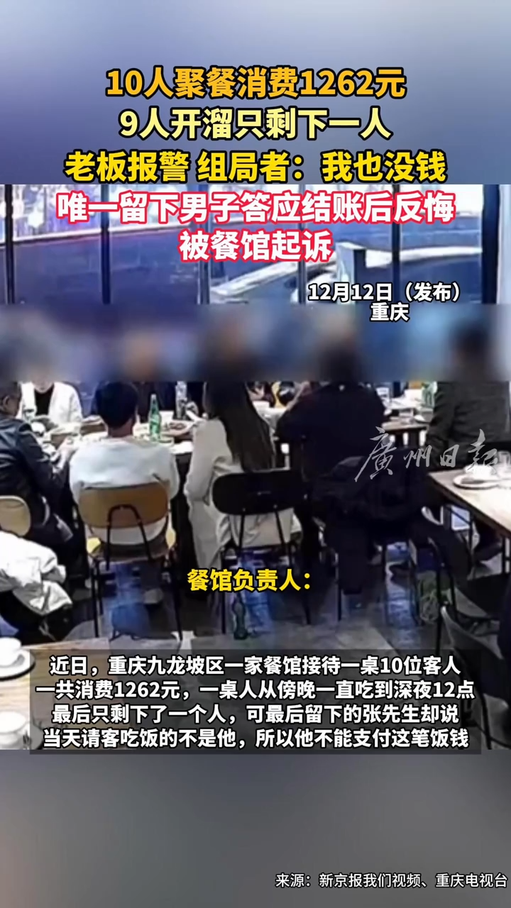 10人聚餐消费1262元 9人开溜只剩下一人