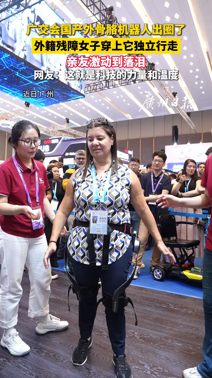 广交会国产外骨骼机器人出圈了,外籍残障女子穿上它独立行走,亲友激动到落泪,网友:这就是科技的力量和温度