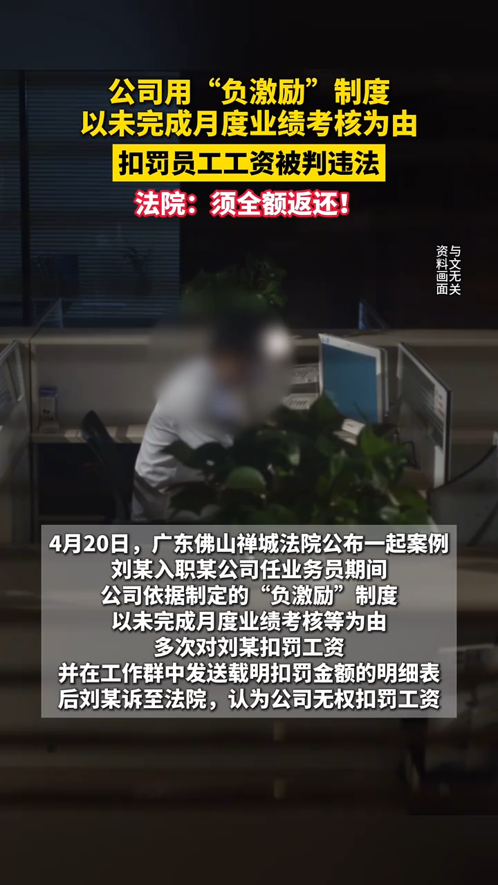 公司用“负激励”制度,以未完成月度业绩考核为由,扣罚员工工资被判违法,法院:须全额返还!