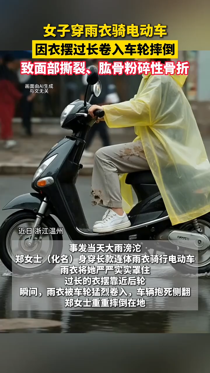 女子穿雨衣骑电动车,因衣摆过长卷入车轮摔倒,致面部撕裂、肱骨粉碎性骨折