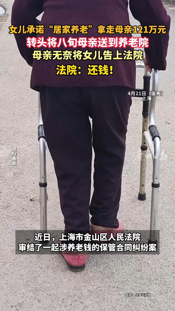 女儿承诺“居家养老”拿走母亲121万元 转头将八旬母亲送到养老院 法院:还钱!