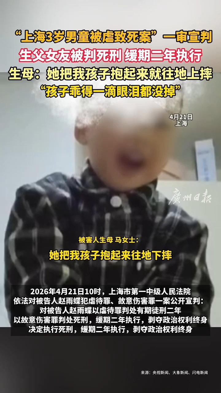 “上海3岁男童被虐致死案”一审宣判 生父女友被判死刑 缓期二年执行