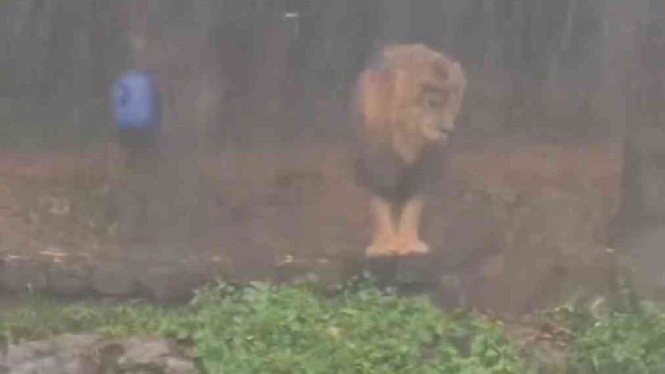广州长隆狮子暴雨中独自淋雨,发型都变成齐刘海