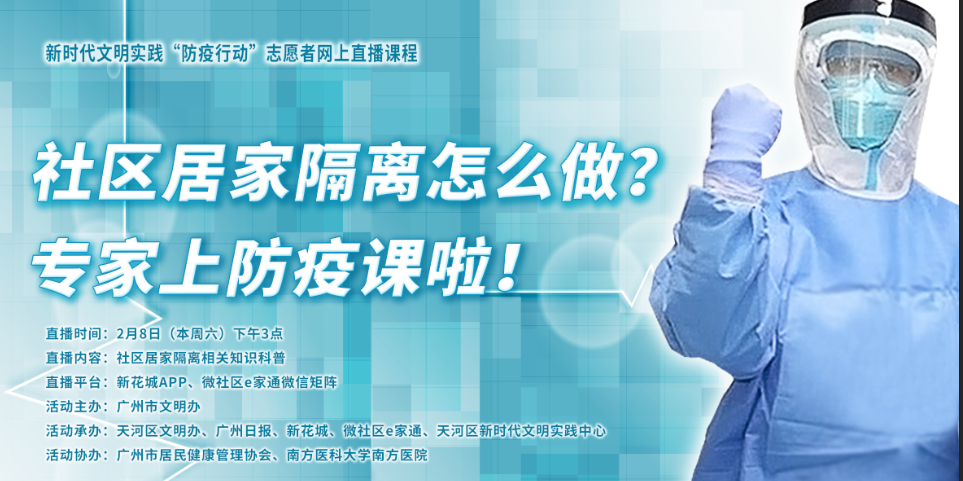 简介:第一期课程,将邀请到南方医科大学南方医院全科医学科主任、社区卫生专家查道刚,南方医科大学南方医院神经外科护士长王晓艳(也是本次新型冠状病毒肺炎疫情期间南方医院感染内科护理总负责人和2003年抗非典期间北京解放军小汤山医院17病区护士长)开讲社区防疫课程,以视频直播的形式,教街坊做好居家隔离的“自我防护”,届时,专家们还将为网友们在线解答防疫的各种疑惑。