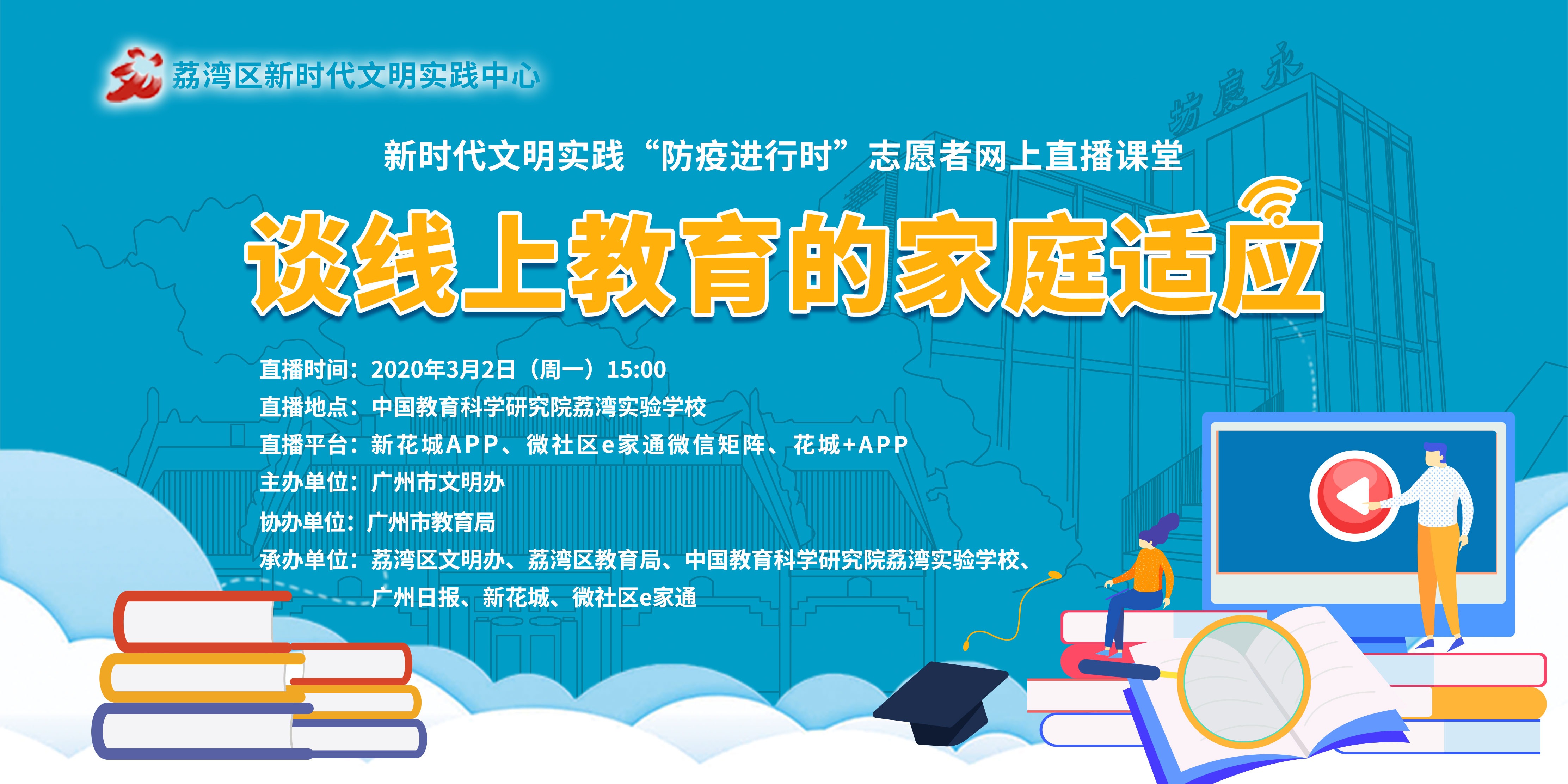 简介:为了更好地协助广大家庭适应线上教育这一新模式,3月2日,广州市文明办将携手广州日报、新花城APP、微社区e家通开展新时代文明实践“防疫进行时”志愿者网上直播课程活动。此次直播将邀请广州市教育研究院德育与心理教育研究室主任蒋亚辉和广州心理特约教研员、广东广雅中学高级心理教师吴小建两位专家,围绕“谈线上教育的家庭适应”这一主题,针对家长的各种担忧和疑虑介绍解决办法以及经验。×