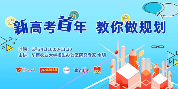 简介:今年是“新高考”实施首年,您是否有了心仪的目标学校,已经为自己的学业方向作了详细的规划?如何规划好自己的未来学业,是广大考生和家长十分关心的问题。6月24日上午10:00,由广州市招考办和信息时报共同发起的“新高考背景下考生的学业规划指导讲座”,华南农业大学招生办公室研究专家余明将为广大学生及家长作指导。