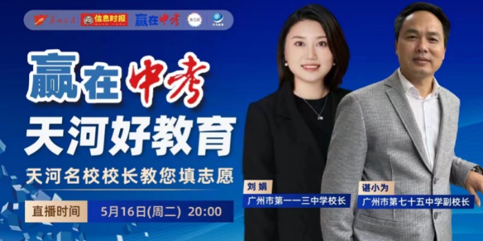 简介:5月16日晚上8点,由广州市招生考试委员会办公室、天河区教育局指导,信息时报社主办,广州市时报微信息科技有限公司承办,天河7所区属高中协办的2023“赢在中考·天河好教育”填报志愿线上指导论坛将在新花城App播出。届时,广州市第一一三中学校长刘娟、广州市第七十五中学副校长谌小为,为学生、家长介绍广州市第一一三中学、广州市第七十五中学的办学特色、招生情况。欢迎广大市民准时收看!