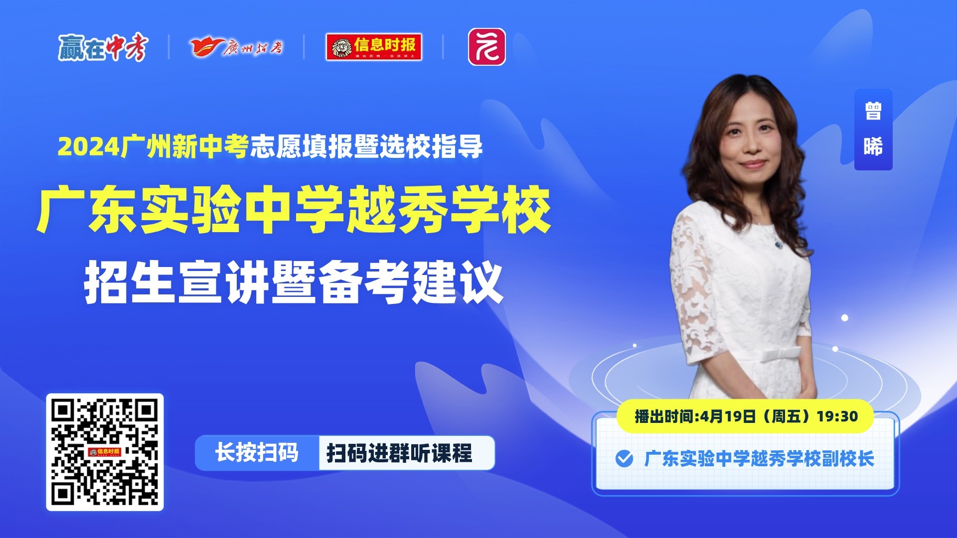 4月19日(本周五)19点30分,广东实验中学越秀学校副校长曾晞将作客直播间,为广大家长和考生们提供科学填报志愿的指导,敬请关注!