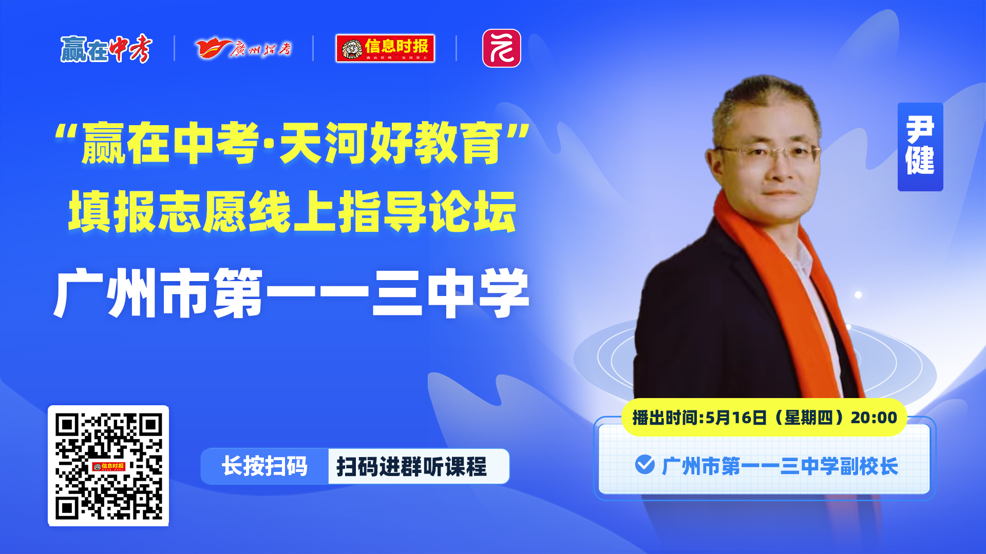 5月16日(周四)20:00,由广州市招生考试委员会办公室、天河区教育局指导,信息时报社主办,广州市时报微信息科技有限公司承办,天河8所区属高中协办的2024年“赢在中考·天河好教育”填报志愿线上指导论坛将在广州日报新花城App播出。届时,广州市第一一三中学副校长尹健将在线介绍学校的办学特色、招生情况等,欢迎广大考生、家长收看!