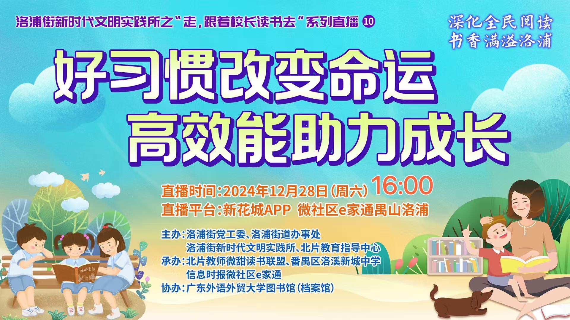 特别提醒:各位观众下午好,本次直播将在今天下午四点播出,敬请期待。 为深化书香羊城全民阅读活动,以书香涵养精神文明,以文化精神助力“百千万工程”,鼓励广大干部和教师带头读书学习,带动孩子们养成阅读习惯,2024年,洛浦街、北片教育指导中心联合信息时报,推出了洛浦街新时代文明实践所之“走,跟着校长读书去”系列直播活动。活动将邀请有关专家、教师、家长代表等围绕阅读主题,深入讨论,分享经验,释惑答疑。