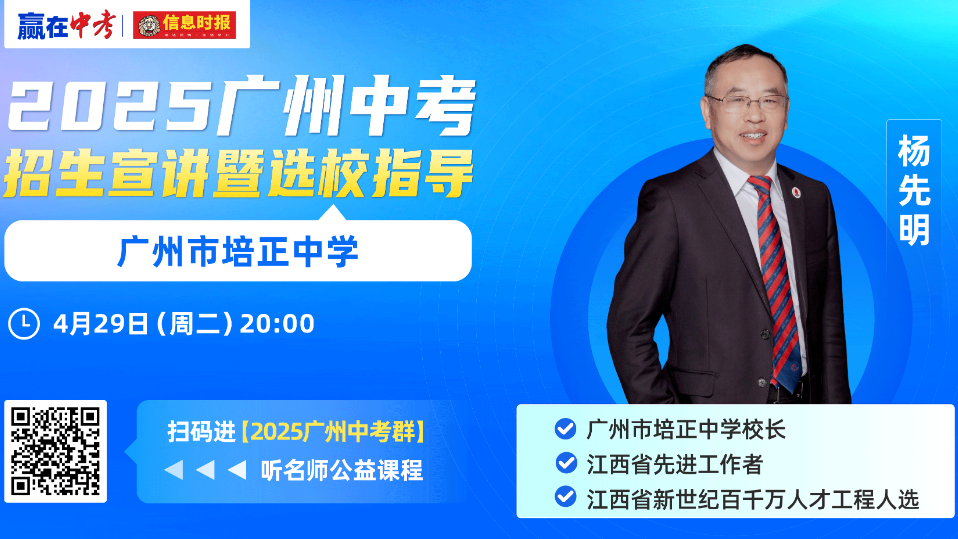 4月29日(周二)20:00,广州市培正中学校长杨先明将做客“2025年广州中考志愿填报线上巡讲暨选校指导”直播间,为你详细解读培正中学办学特色以及2025年招生情况!