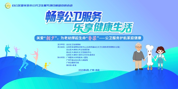 为全面推进国家基本公共卫生服务项目,提升居民健康素养,助力健康白云建设,白云区卫生健康局、区疾病预防控制中心、各基层医疗卫生机构联合推出“基本公共卫生服务”系列直播活动。6月20日15:00,第六场直播将以“关爱‘朝夕’,为老幼撑起生命‘脊梁’——公卫服务护航家庭健康”为主题,为辖区居民提供权威、实用的健康指导,筑牢基层健康防线。