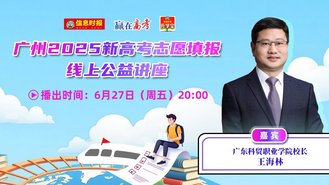 6月27日(周五)20:00,广东科贸职业学院校长王海林将做客“广州2025新高考志愿填报线上公益讲座”直播间,为你详细解读广东科贸职业学院办学特色以及2025年招生情况、填报建议,欢迎广大考生、家长收看!