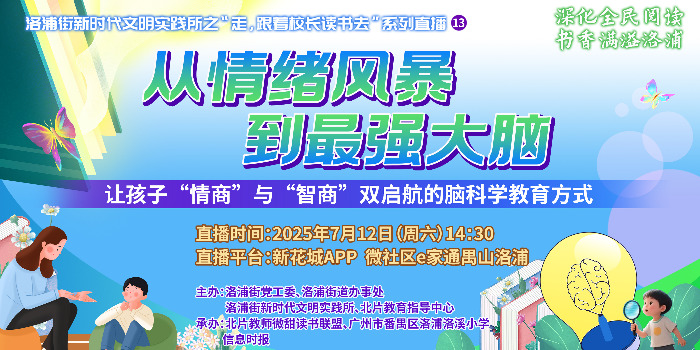 为深化书香羊城全民阅读活动,以书香涵养精神文明,以文化精神助力“百千万工程”,鼓励广大干部和教师带头读书学习,带动孩子们养成阅读习惯,2025年,洛浦街、北片教育指导中心继续联合信息时报,推出了洛浦街新时代文明实践所之“走,跟着校长读书去”系列直播活动。活动将邀请有关专家、教师、家长代表等围绕阅读主题,深入讨论,分享经验,释惑答疑。活动将以直播形式展现,在广州日报新花城平台进行直播,一起关注。