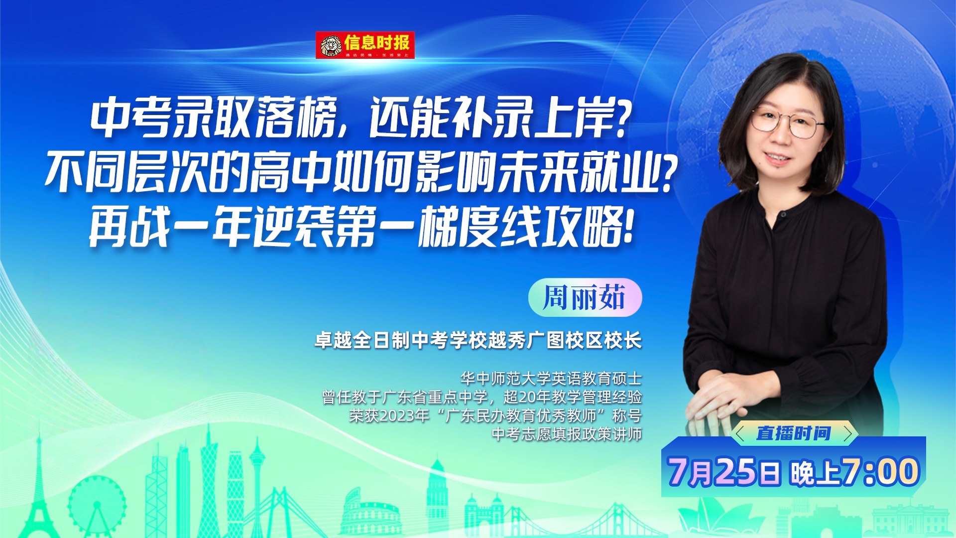 中考录取落榜,还能补录“上岸”?7月25日晚上7:00,卓越全日制中考学校越秀广图校区校长周丽茹将做客直播间,详细解读中考复读政策、补录填报策略以及卓越全日制中考学校办学特色,欢迎广大考生家长收看。