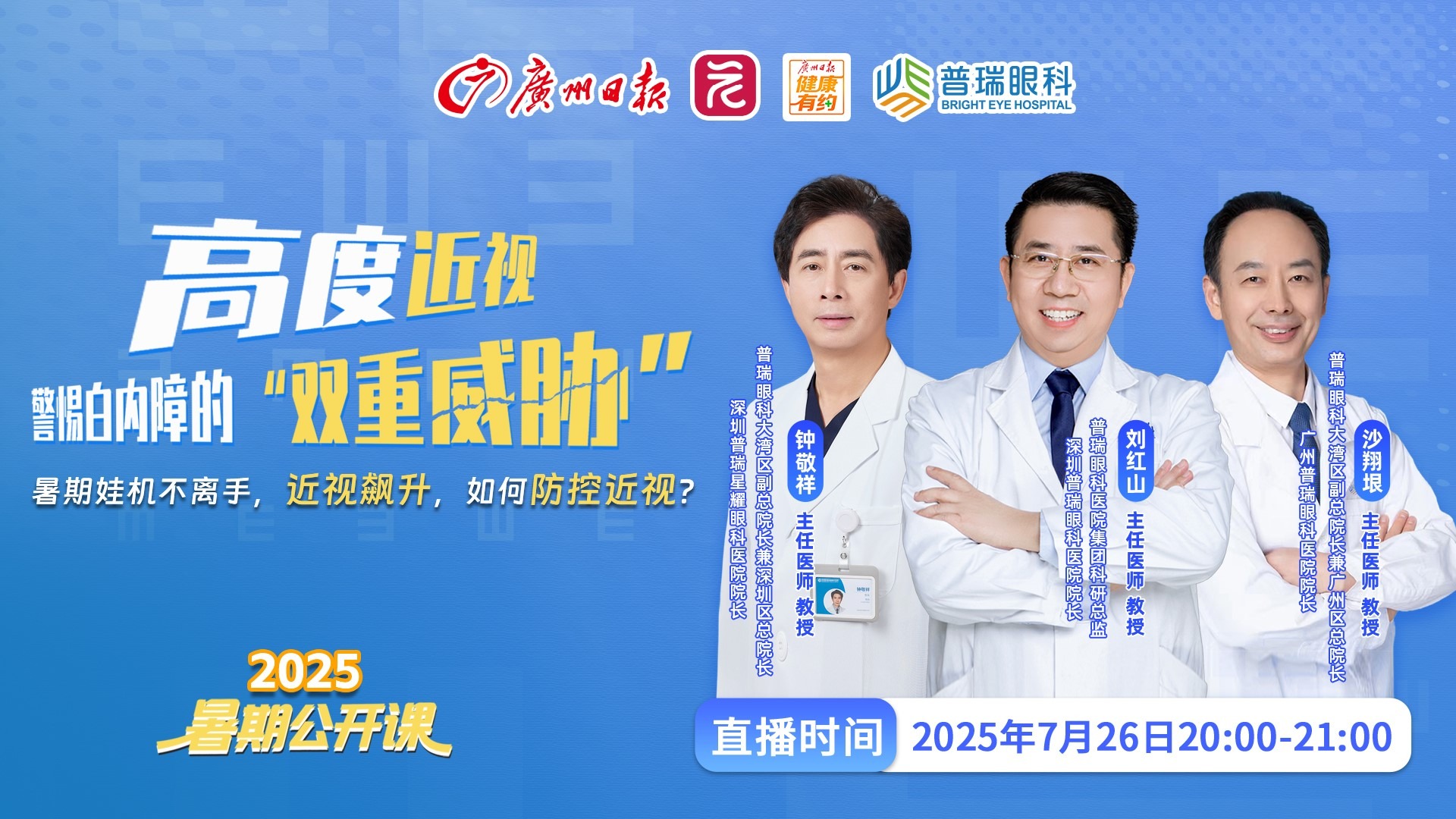 暑期娃机不离手,近视飙升,如何防控近视?高度近视会导致白内障早发?……正值暑假,不少孩子放假在家,沉迷电子产品,视力问题成了家长最大的焦虑。7月26日(周六)20:00—21:00,2025暑期公开课第二场,广州日报将邀请普瑞眼科医院集团科研总监、深圳普瑞眼科医院院长刘红山主任医师、教授,普瑞眼科大湾区副总院长兼广州区总院长、广州普瑞眼科医院院长沙翔垠主任医师、教授,普瑞眼科大湾区副总院长兼深圳区总院长、深圳普瑞星耀眼科医院院长钟敬祥主任医师、教授,聚焦“近视防控”与“眼健康前沿技术”,为孩子们的眼睛保驾护航。