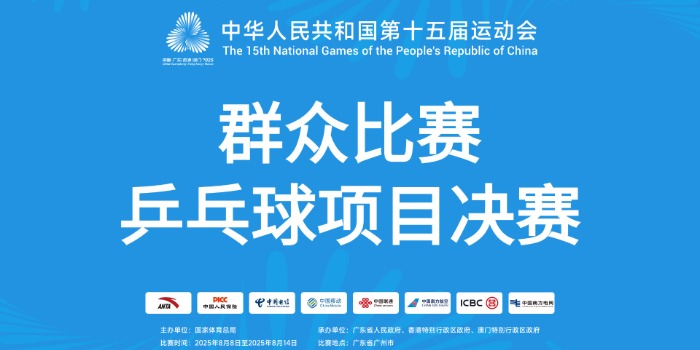 第十五届全国运动会群众比赛乒乓球项目决赛于广州天河体育中心体育馆、广州市羽毛球运动管理中心打响,来自全国各地的乒乓球民间高手在为期7天的比赛中角逐包括团体和单项在内合计10枚金牌。8月14日将产生男子单打、女子单打共8枚金牌(25岁—39岁组、40岁—49岁组、50岁—59岁组、60岁—69岁组)。