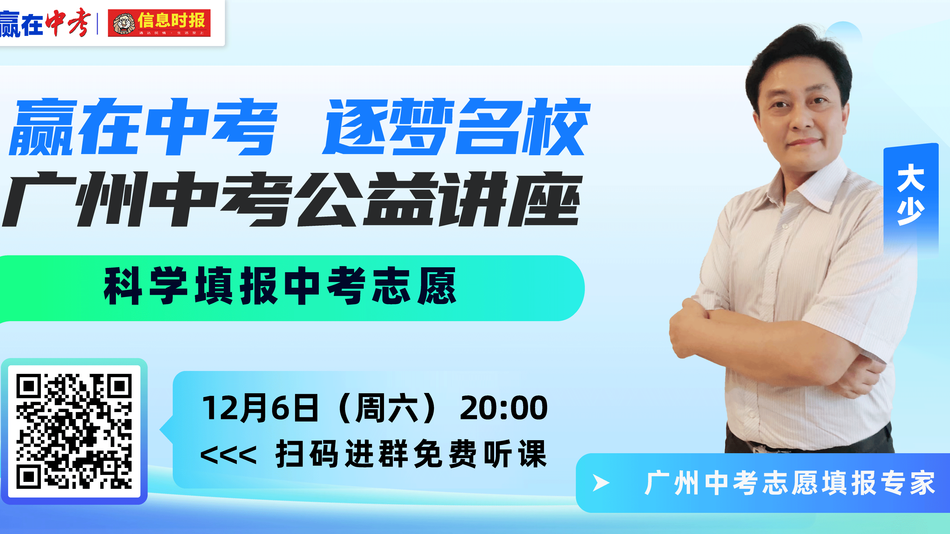 由信息时报主办的“赢在中考 逐梦名校”2026广州中考公益讲座活动继续举办。12月6日(本周六)20:00,本地教育自媒体大咖“大少论校”公众号创办人将做客直播间,为广大家长考生“支支招”缓解升学、择校焦虑。欢迎广大学生、家长准时收看!