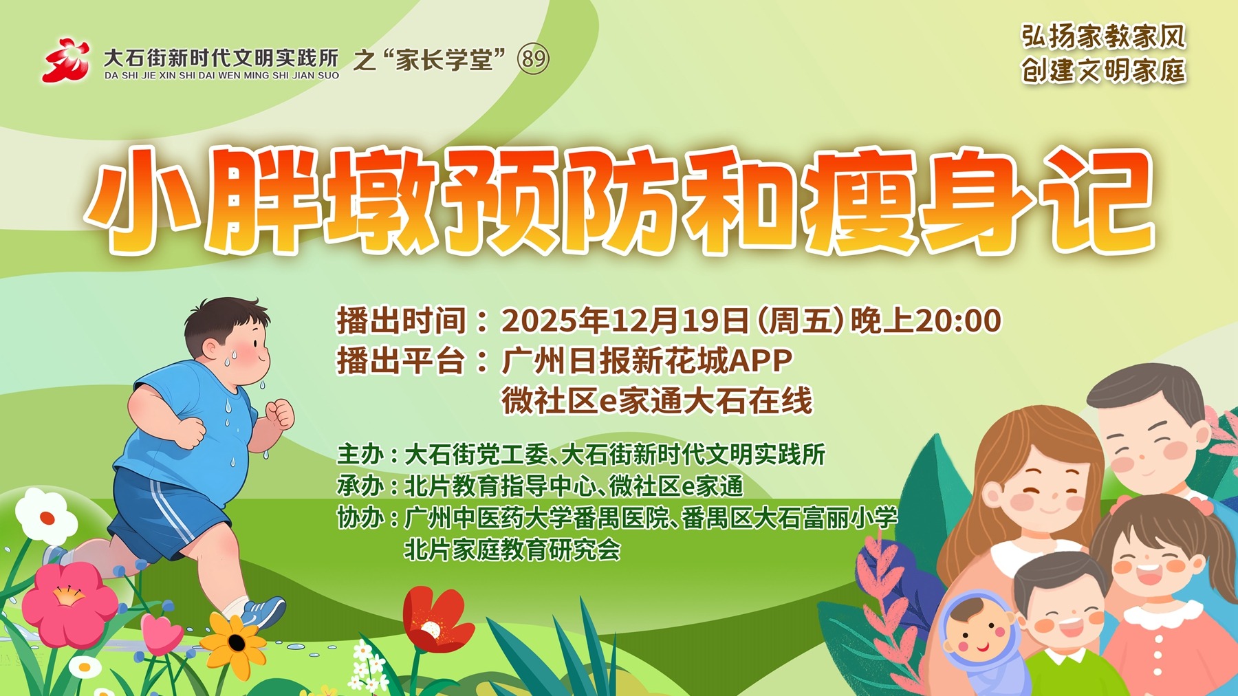 大石街新时代文明实践所之家长学堂第89期节目将于12月19日(周五)晚上8:00播出,本期主题为《小胖墩预防和瘦身记》,特邀广州中医药大学番禺医院肥胖防治中心的专家们走进节目间,一起探讨影响孩子健康成长的重要问题——儿童肥胖问题。
