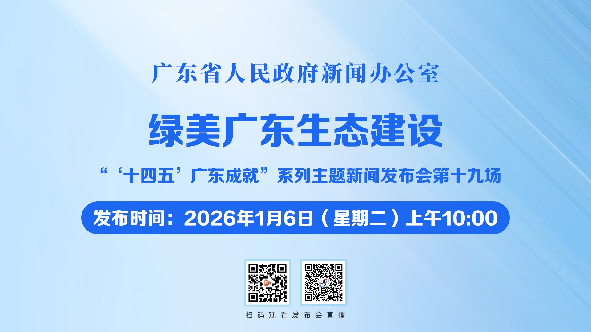 广东省人民政府新闻办公室定于2026年1月6日上午10时召开“‘十四五’广东成就”系列主题新闻发布会,主题为:绿美广东生态建设,邀请省生态环境厅主要负责人作主发布,省自然资源厅、省住房城乡建设厅、省农业农村厅、省林业局负责人参加,介绍“十四五”时期广东省推进绿美广东生态建设情况和成效,并回答记者提问。