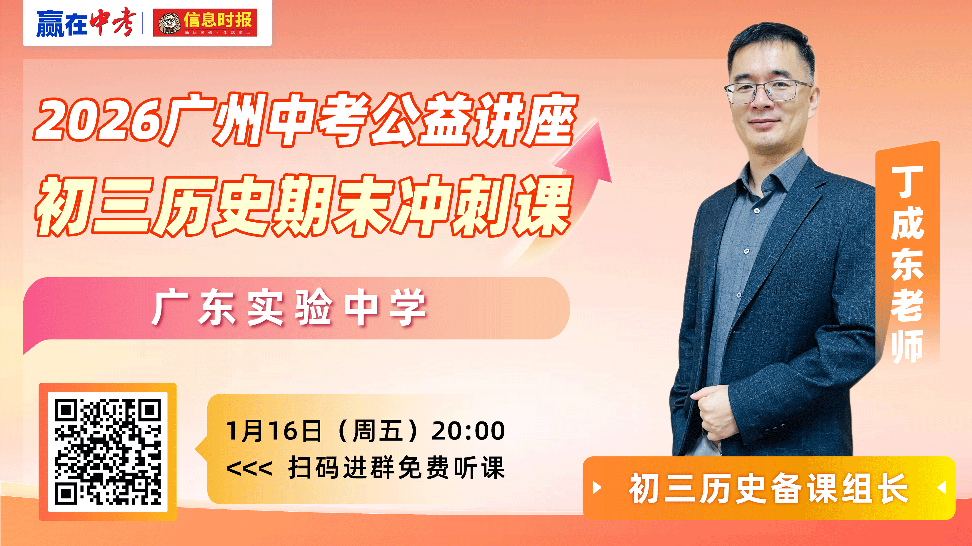 临近期末考,来自广东实验中学、广州大学附属中学、广东广雅中学、广州外国语学校、广州中学等名校名师将线上开讲助力考生备考冲刺!1月16日(周五)20:00,广东实验中学初中历史备课组长丁成东老师将分享历史科目的备考策略,欢迎广大学生、家长准时收看!