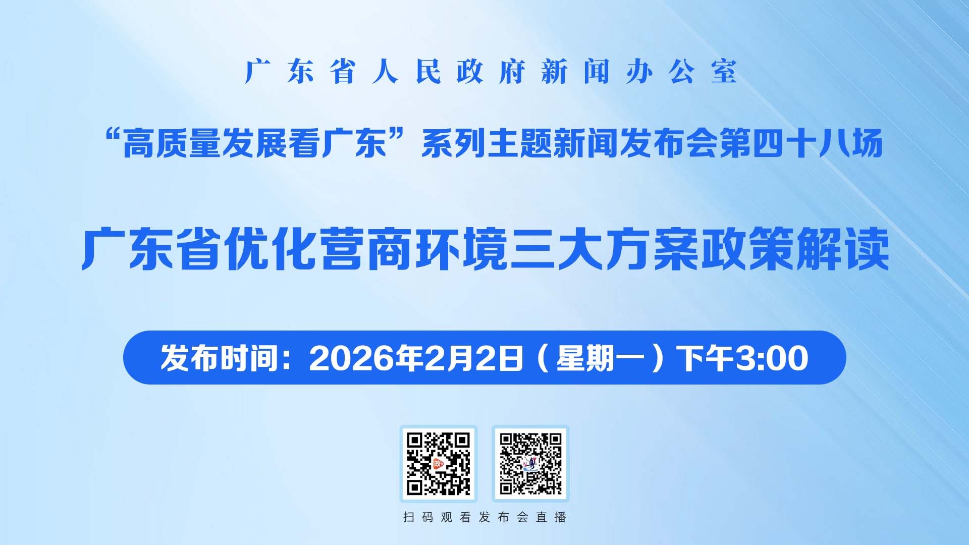 广东省人民政府新闻办公室定于2026年2月2日下午3时在广东大厦三楼多功能厅举行新闻发布会,邀请广东省人民政府副秘书长、新闻发言人胡洪同志作主发布,省发展改革委、省司法厅、省商务厅主要负责人参加,介绍广东省2026年优化营商环境三个工作方案主要内容、特色亮点和创新举措,并回答记者提问。南方网、粤学习客户端将进行视频和图文直播,敬请关注!