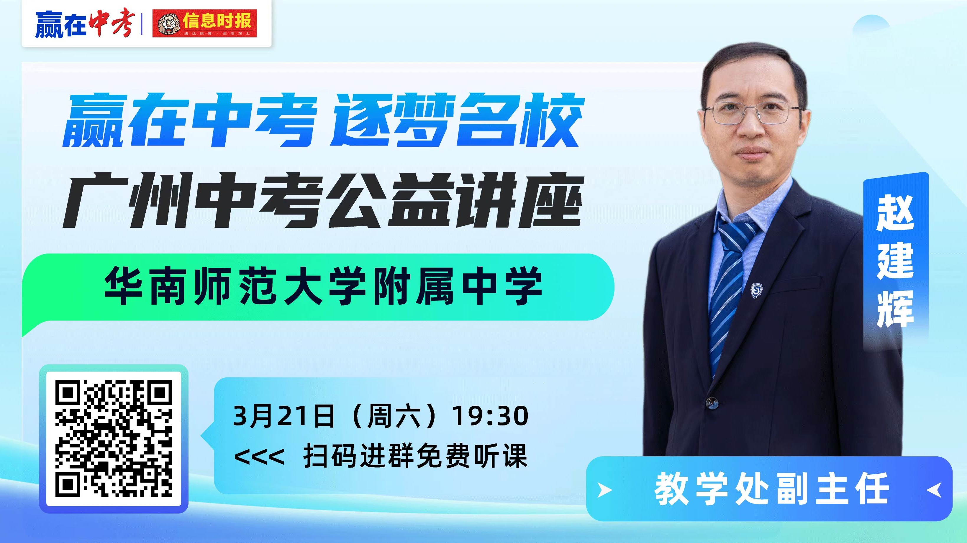 由信息时报主办的“赢在中考 逐梦名校”2026广州中考公益讲座活动继续进行。3月21日(本周六)19:30,华南师范大学附属中学教学处副主任赵建辉将做客直播间,为你详细解读华附办学特色和招生信息,欢迎广大学生、家长准时收看!