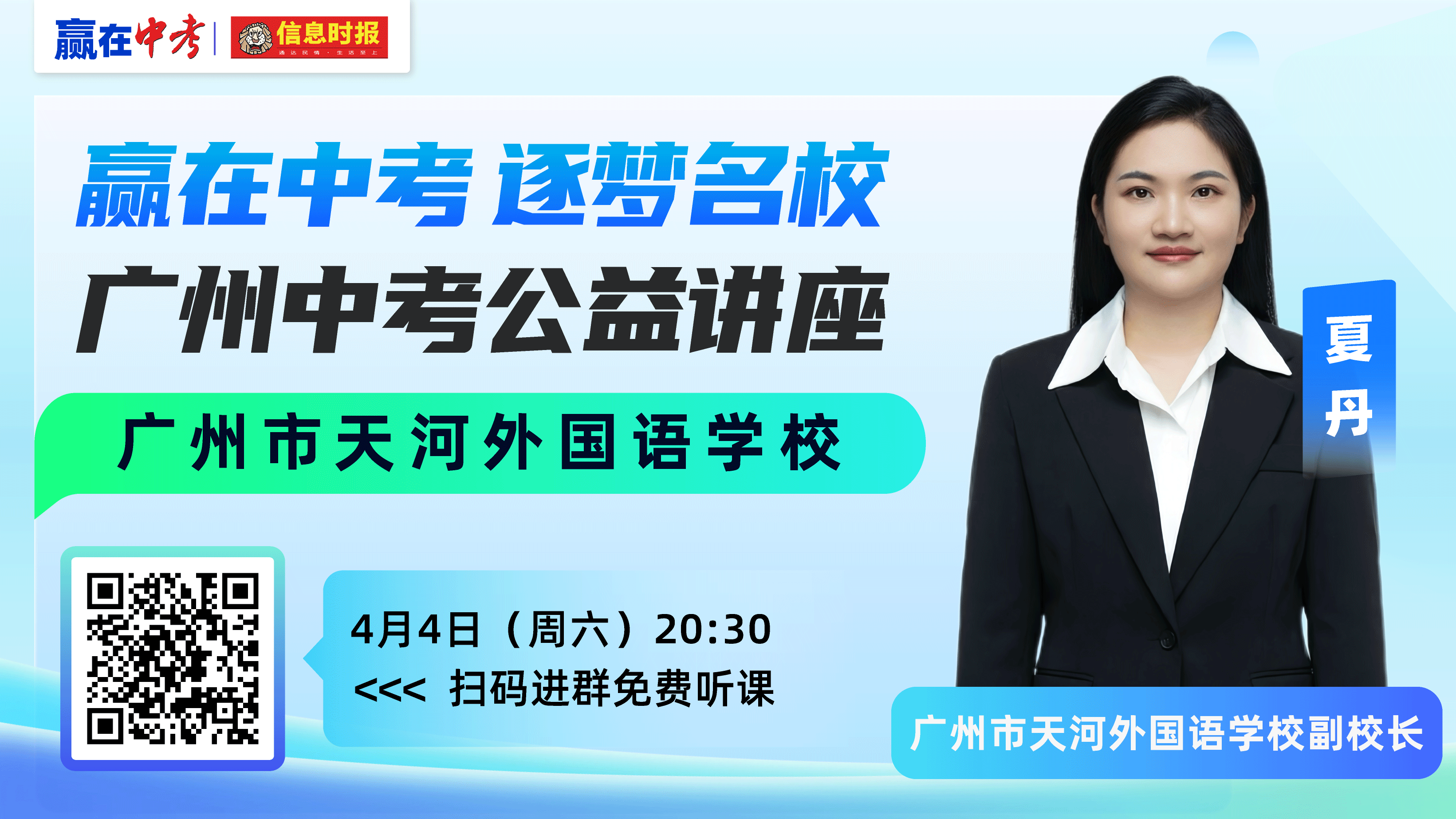 由信息时报主办的“赢在中考 逐梦名校”2026广州中考公益讲座活动继续进行。4月4日(本周六)20:30,广州市天河外国语学校副校长夏丹将做客直播间,为你详细解读广州中学办学特色和招生信息,欢迎广大学生、家长准时收看!