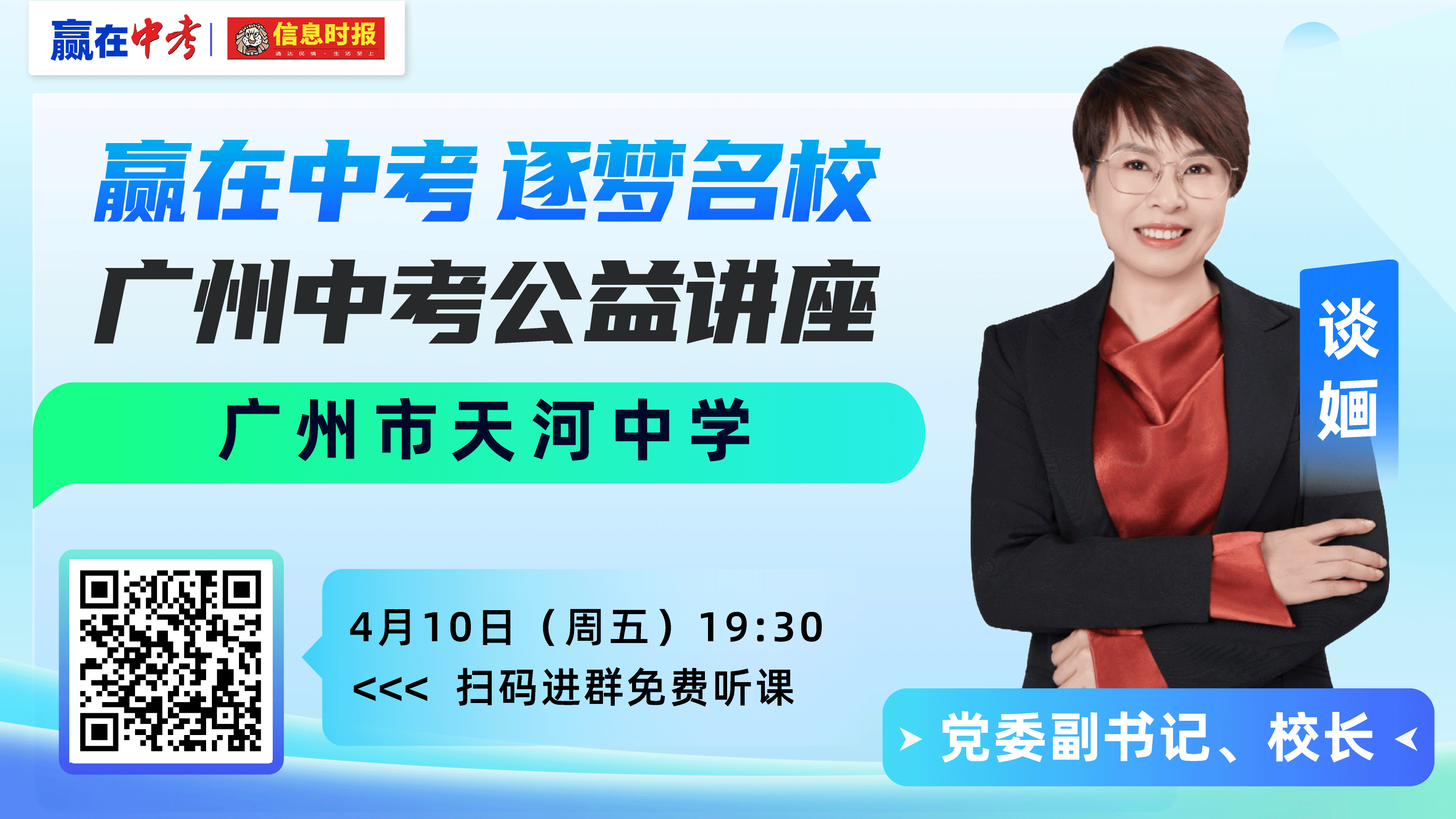 由信息时报主办的“赢在中考 逐梦名校”2026广州中考公益讲座活动继续进行。4月10日(本周五)19:30,广州市天河中学党委副书记、校长谈婳将做客直播间,为你详细解读广州市天河中学办学特色和招生信息,欢迎广大学生、家长准时收看!