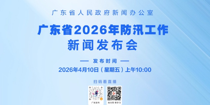 广东省人民政府新闻办公室定于2026年4月10日上午10:00在广州广东大厦2楼春华厅举行广东省2026年防汛工作新闻发布会,邀请广东省防汛防旱防风总指挥部副总指挥、省应急管理厅厅长王再华作主发布,省自然资源厅、省水利厅、省气象局负责人参加,介绍2026年防汛备汛工作等情况,并回答记者提问。敬请关注!