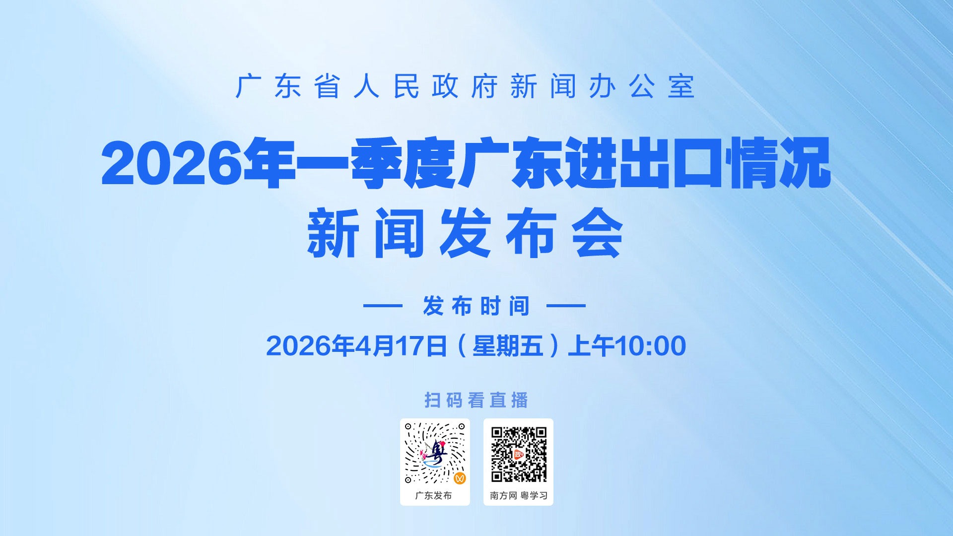 广东省人民政府新闻办公室定于4月17日上午10时举行2026年一季度广东进出口情况新闻发布会,邀请海关总署广东分署、广州海关、深圳海关、湛江海关负责同志介绍2026年一季度广东外贸进出口情况及省内海关多措并举稳外贸有关情况,并回答记者提问。