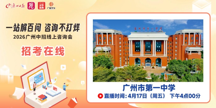 2026广州中招线上咨询会“招考在线”广州市第一中学专场,将于4月17日(周五)下午4点开始。来自广州市第一中学的老师将介绍今年该校招生的相关信息。