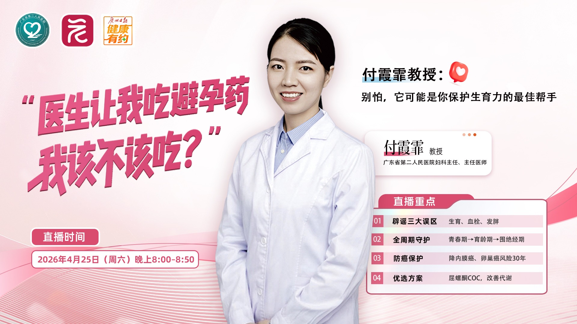 复方口服避孕药,很多人可能还停留在“只是用来避孕”的认知阶段。在门诊,很多患者可能因为一些妇科疾病,专家让她吃避孕药,患者很不理解,但事实上,避孕药早已成为全球应用最广泛、证据最充分的兼具避孕与疾病治疗双重作用的药物之一。如何科学认识、规范使用避孕药,让它在保护女性生育力、管理妇科疾病中发挥更大作用?4月25日(周六)晚上8时,我们邀请广东省第二人民医院妇科主任、主任医师付霞霏教授为大家深度解读。
