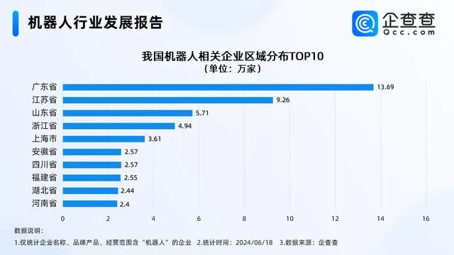 记者查询数据了解到,截至今年6月,我国现存机器人相关企业71.67万家。从区域来看,广东省机器人企业数量高达13.69万家,在数量上以绝对的优势稳居全国榜首。江苏省以9.26万家的数量位居第二。