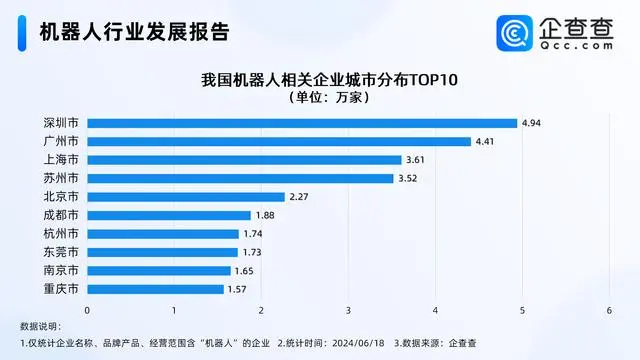 从城市分布来看,深圳与广州作为广东省的双核引擎,分别拥有4.94万家和4.41万家机器人相关企业,形成了强大的产业集聚效应。上海、苏州紧随其后,位列第三、四位。